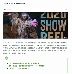 CONTACTお問い合わせ お問い合わせフォーム お電話でのお問い合わせはこちら 03-6386-8409 受付時間:平日10:00〜19:00 ( 夏季休暇、年末年始除く ) メールでのお問い合わせはこちら メディアフォーユー株式会社とは、東京都世田谷区にある映像制作会社です。動画作成はもちろんのこと、映像企画・動画編集・動画やデジタルメディアを使ったマーケティングまでを幅広く手掛け、新卒者のための採用動画、セミナーや就職説明会のための企業紹介ビデオ、集客のための広告動画や販売促進のためのプロモーションビデオ(PV)、社内イベントや式典などで上映するための社史動画なども取り扱っております。今やウェブでの集客や販売、あるいはプロモーションやマーケティング活動において動画作成や映像制作は欠かせない重要な戦略ツールになっています。プロとしてテレビ業界で活躍し、多くの実績を持つメディアフォーユー株式会社だからこそ提供できるハイクオリティな映像は、お客様のご期待にも十分応えることができる仕上がりをお約束いたします。